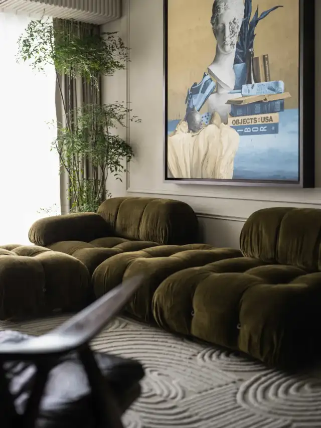 此外,雕塑花盆的加入为客厅带来戏剧性的视觉焦点与独特的垂直感,而纹理丰富、质感细腻的地毯则进一步丰富了空间的层次与质感,让整个客厅在功能与美学之间达成平衡,营造出既舒适又富有艺术气息的居住环境。