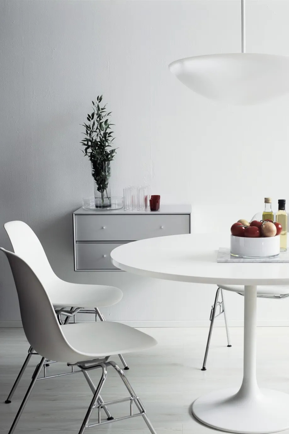 奶白色的餐边柜集收纳与展示功能于一体,摆放着精致餐具与绿植。木质餐桌搭配简约餐椅,家人、朋友围坐用餐,温馨氛围在奶白的包裹下愈发浓郁。