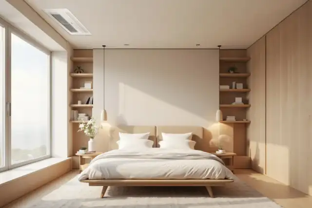 延续奶白色主调,搭配柔软床品,仿佛置身于云朵之上。床头背景墙用简约线条勾勒,增添几分优雅。