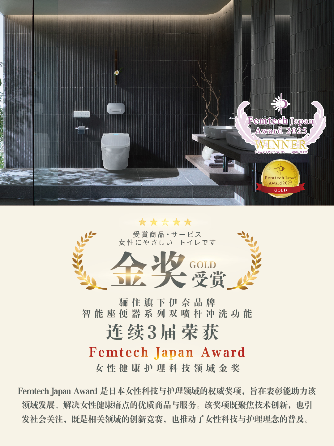 Femtech Japan Award是聚焦日本女性科技与护理领域的权威奖项,2025 年是其第 4 届。品牌继2023年、2024年获银奖之后,今年重磅“霸榜”。权威认可,标杆加持,伊奈马桶的人性化设计,在推动女性科技与护理理念的普及方面,将获得更广泛的关注,更加夯实消费者的品牌信赖感。