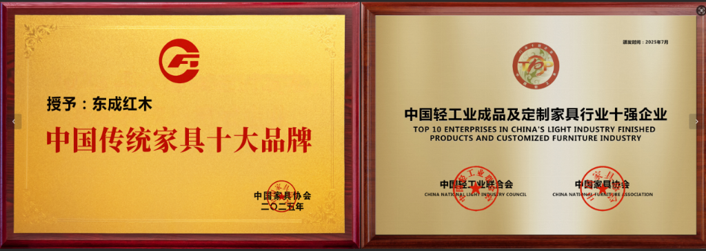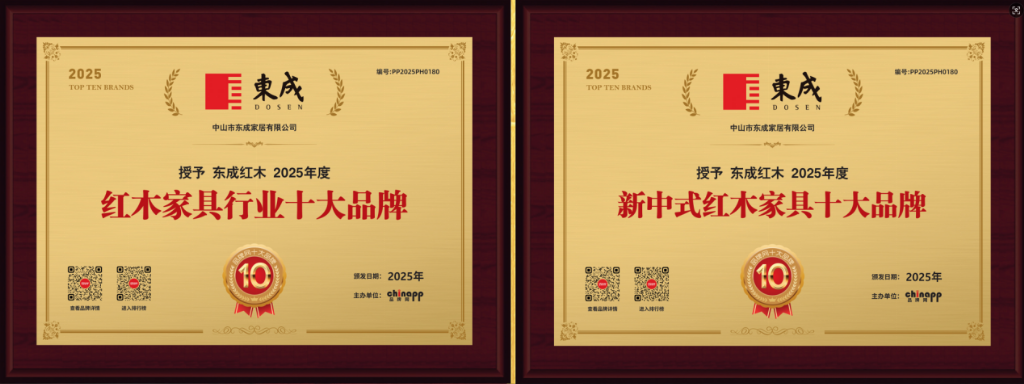 2025年9月,东成红木凭借其在中式家具领军卓越的品牌实力、优质优价和创新的设计理念,同时入选“中国红木家具十大品牌”和“新中式红木家具十大品牌”两大权威榜单。