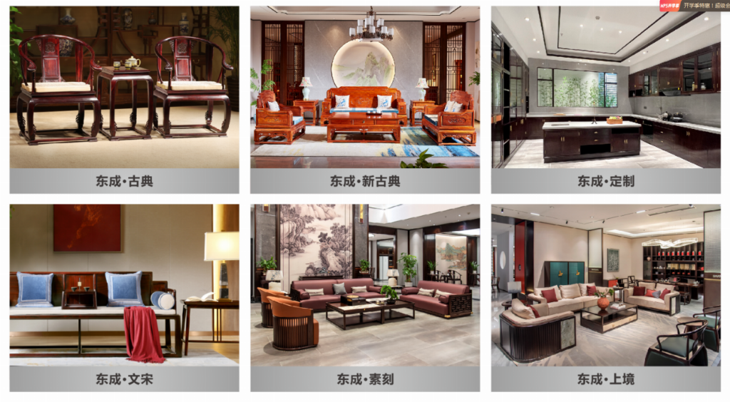 | 东成古典 | 1990 年 | 复刻明清经典,传承经典,再创经典 | 海南黄花梨、印度小叶紫檀、大红酸枝等名贵木材 |