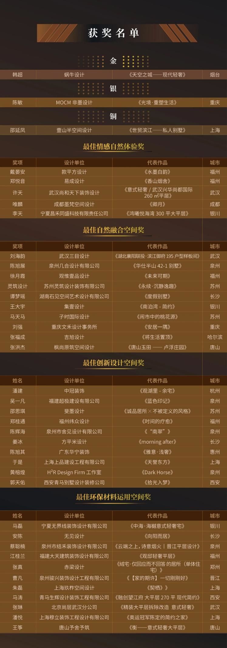 本次大赛的举办,旨在挖掘更多具有创新精神和专业实力的设计师,推动设计行业的发展,同时也为设计师们提供一个展示才华、交流经验的平台。通过赛事,激发设计师们的灵感,让他们能够将更多的创意和理念融入到人居空间的设计中,为人们创造更加美好的生活体验。经过长达一个月的投票及评审环节,最终38位参赛选手获得荣誉!