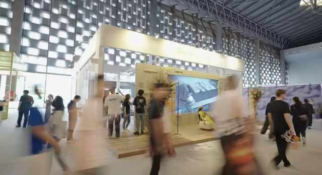 展厅主入口采用退台式设计,通过层级递进的建筑语言创造空间纵深感。DYROEK得岩的金丝楠天然石材通过品牌特有的切割工艺技术,以及对建筑大师卡洛·斯卡帕设计的致敬,展现本真纯粹。选用珍贵硬木的VETEDY的铺设让人犹如来到午后庭院,一旁搭配的自然野趣花艺造景,形成有机的材质对话,经过四个月风干与半月低温慢煮处理的VETEDY户外地板,拥有专利卡扣含玻璃纤维/PU复合材料(26种成分),抗断裂且具记忆回弹。石材与木材的朴质,让材质触感与自然元素相互渗透,在确保功能性的同时,构建了一个既能唤起情感共鸣又具备引导性的过渡空间,这里不仅是展厅焦点,吸引众多参观者驻足品味,更获得设计师的赞誉。