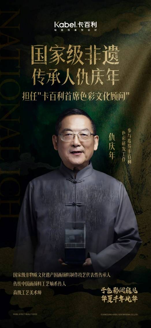 近日,中国艺术涂料行业迎来一则重磅消息:国家级非物质文化遗产“国画颜料制作技艺”代表性传承人、传统中国画颜料工艺嫡系传人、高级工艺美术师仇庆年先生,正式担任卡百利艺术涂料“首席色彩文化顾问”。