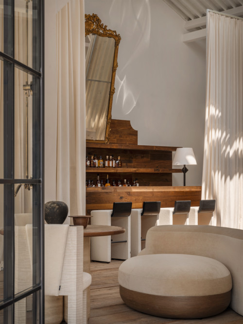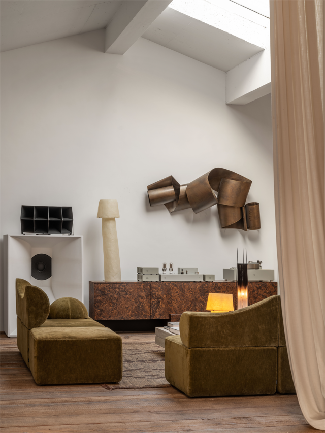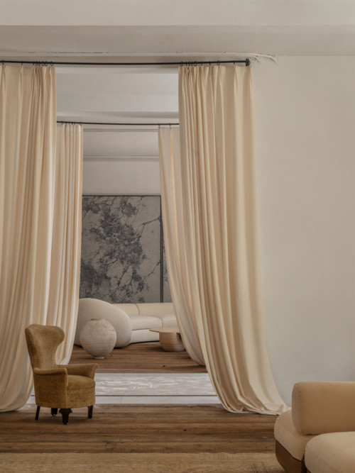 顶层空间堪称艺术殿堂般的存在,七米挑高的坡屋顶阳光房设计,令阳光如金色瀑布般倾泻而下。整个顶层以一组“AVE ROME”系列家具作为核心精神锚点,垂坠的亚麻布幔轻柔地将空间巧妙隔断成多个区域,每一件作品都以恰到好处的姿态,尽情彰显着自身独特的魅力。