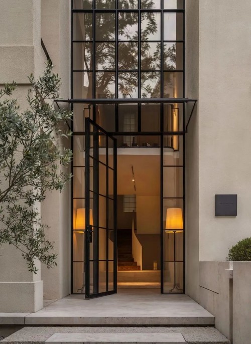 沿石阶而上,挑高6米的入户门廊以旧木地板与风化砖墙营造出一种岁月沉淀的感觉。推开玻璃门,光线从高窗倾泻而下,在地面投射出树叶的斑驳光影,这是孟也刻意保留的“时光滤镜”,让自然成为空间的第一位策展人。