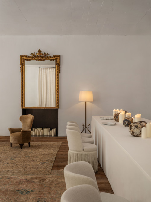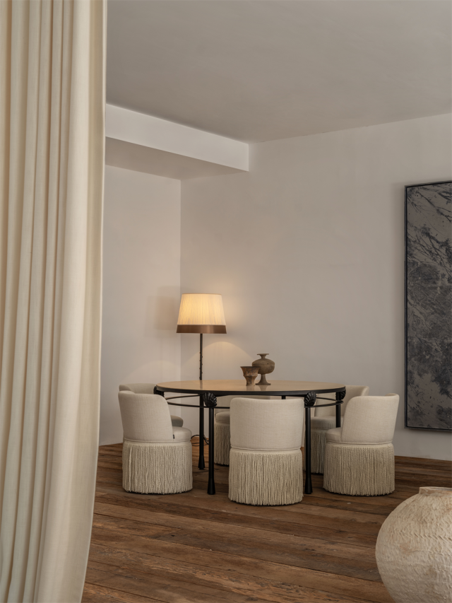 进门往左,目光瞬间就会被这张长达几米、铺着浅色桌布的“永恒长桌”所攫取。桌面上,陈列着众多艺术家的匠心之作。一列“信风”单椅宛如忠诚的侍者,静静等候着贵宾的到来。