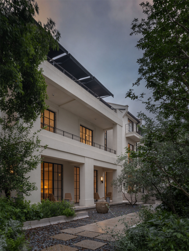 从铁艺大门步入庭院,350平方米的花园里,用低饱和度的碎石铺就一条蜿蜒小径,绿植点缀在小径两旁,植物在晨光中舒展枝叶,仿佛在为访客吟诵一首无声的欢迎诗。