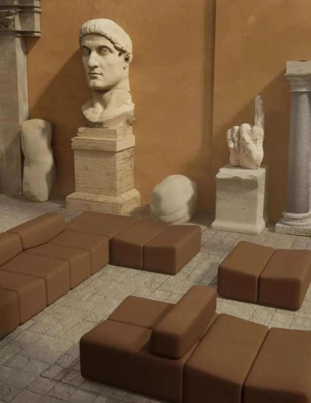 整个展厅布局呈现罗马风的气质,正如这一季的设计新品“AVE ROME”系列,将石柱的刚毅线条与雕花的柔美曲线巧妙融合。这也巧妙蕴含着品牌创始人的设计哲学:设计应成为时间的背景,而非主角。装饰性元素被弱化,转而凭借材质、光影与比例间的微妙平衡,让空间本身成为故事的讲述者。