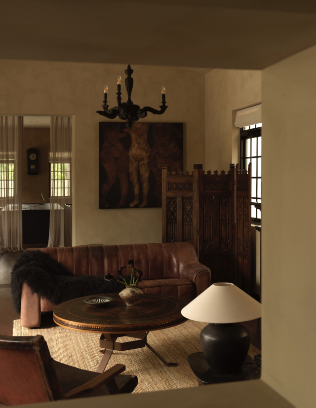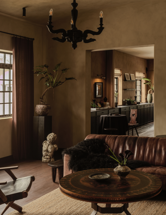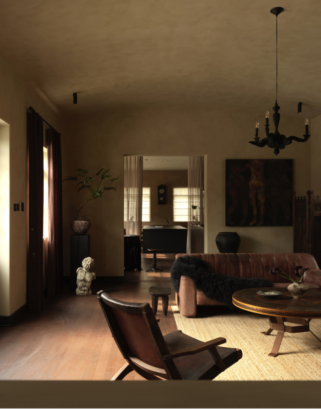 会客区是进入空间后的首个场景,以壁炉为中心设计了围合式“客厅”。客厅以暗棕色壁炉墙为中轴线,两侧对称分布壁灯、沙发软饰和复古老钢窗。粗粝墙面搭配敦厚皮沙发、厚重中古折叠椅,围绕着古铜色圆几,构成微妙平衡。壁炉经黑色混合油打磨,内部镶嵌暗黄色手工砖,散发着深邃的故事感。