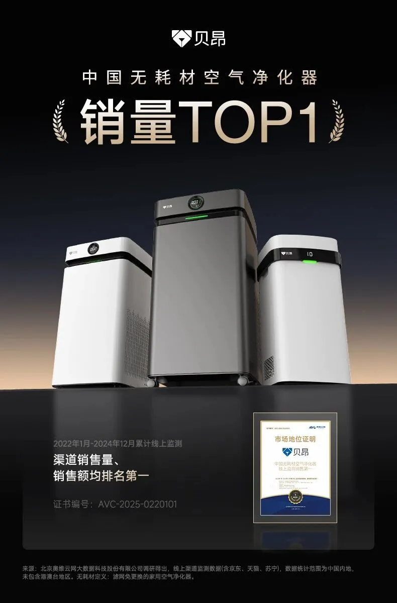 一年一度的双十一购物狂欢节进入白热化阶段,各大品牌纷纷晒出战绩,市场竞争愈发激烈。在此背景下,专注于空气净化领域的贝昂智能传来重磅捷报:全渠道销量如期实现显著增长,更凭借强劲的产品实力与市场口碑,成功斩获 “中国无耗材空气净化器销售量、销售额双第一” 权威认证,用实打实的成绩领跑细分赛道,成为双十一空气净化品类中的亮眼黑马。