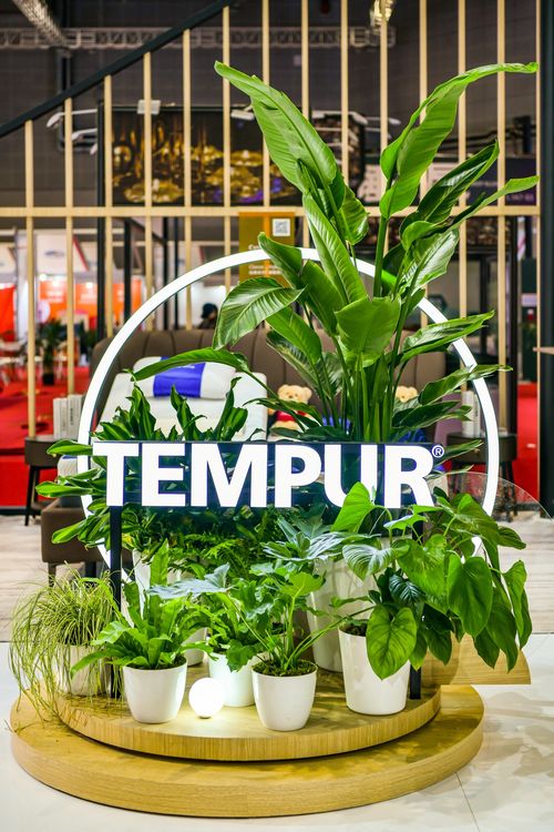值得一提的是,泰普尔展台侧入口巧妙运用品牌LOGO作为核心视觉元素,以流畅线条勾勒出人体躺卧时的自然曲线,清晰呈现肩、腰、腿的生理弧度,直观传递品牌“贴合人体、科技支撑”的产品特性。结合简洁大气的字体设计,进一步突出“TEMPUR”标识,不仅强化了品牌对产品品质的严苛把控与丹麦原装进口的纯正血统,更通过“人体曲线+极简线条”的艺术化表达,将品牌核心价值融为一体,在传递功能诉求的同时,呈现出专业、高端的品牌形象,瞬间抓住观众视线,实现品牌调性与视觉呈现的完美统一。