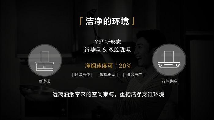 烹饪的环境是洁净的。油烟的净化再也不是传统的单面吸烟,多维度、全方位的净化油烟才让我们远离油烟带来的空间束缚。