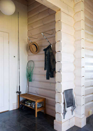 设置在室外的玄关完全独立于室内空间,因此在设计上就有了更大的发挥空间。玄关在使用功能上,可以用来作为简单地接待客人、接受邮件、换衣、换鞋、搁包的地方,也可设置放包及钥匙等小物品的平台。淡雅的木质元素的加入,增添了室内更多的自然情愫。简单的木条矮凳,下端做收纳,上端则为主人提供最为贴心的休憩换鞋好地方。