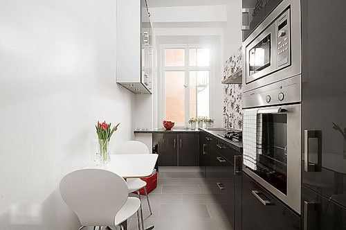 在这间狭长型的厨房里,屋主还摆设了一个餐桌、两把餐椅,依然简洁的设计风格,给人的感觉却是一样的美好。