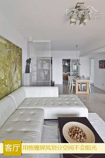 设计解析:年轻、个性、充满创意的生活空间从客厅走起,光滑、纯白的沙发背景墙做了凹凸纹理,一直延伸到餐厅区域,扩大空间感。