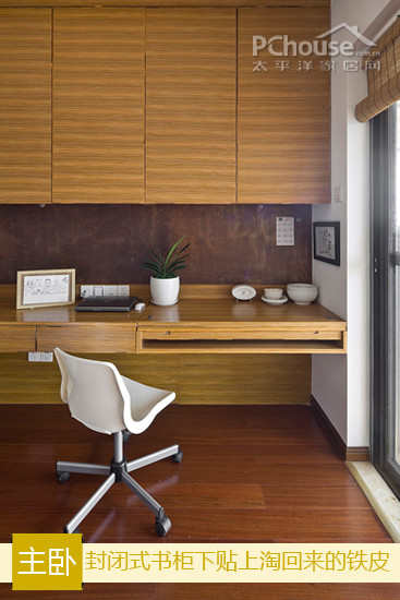 设计解析:卧室改用褐色地板,让空间显得沉静、自然。设计师设计和定制的床头柜独具匠心,里面由多个小格子组成,方便分类;上面盖上玻璃,一目了然;背景墙贴上一条木板,使柜子仿佛从墙面生长而出。