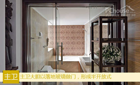 设计解析:时尚的设计师当然不甘于整个房子都太静谧平和,主卫大胆以落地玻璃做门,关上房门变可享受全然放松、视野通透的卫浴时光。