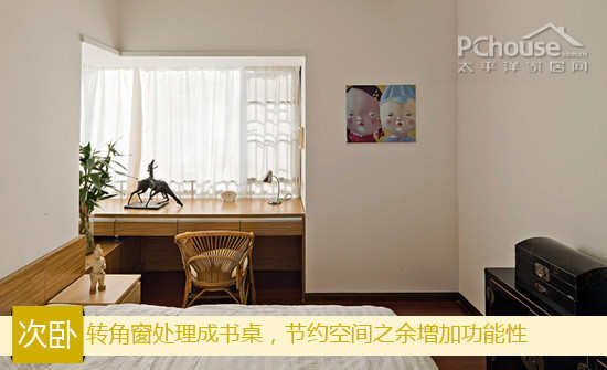 设计解析:儿童房延续主卧的风格,并最大限度地利用起空间。转角窗处理成书桌,白纱既能挡强光,又能让自然光源投射进来,确保明亮度。