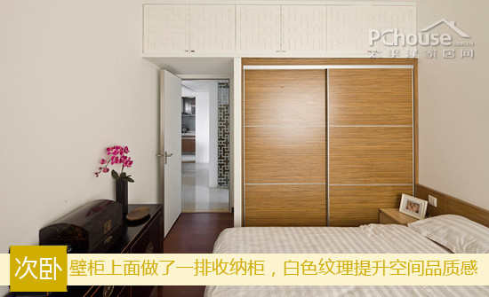 设计解析:一张符合空间气质的中式椅子和箱子用于置放杂物,大大的壁柜满足衣物的收纳需求。壁柜上面同时做了一排收纳柜,白色柜门的纹理提升了空间的品质感。