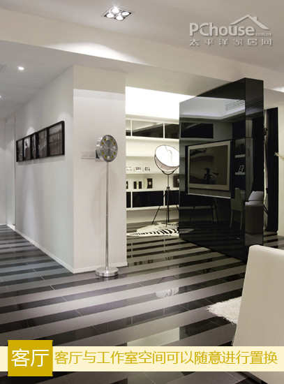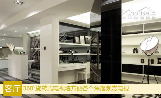 设计解析:伴随着可推动和旋转的黑色电视墙,客厅与工作室在类似游戏的方式中进行置换,即便是在餐厅吃饭或吧台饮酒也能看到电视,成为本案最大的亮点!
