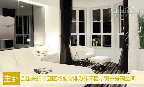 设计解析:主卧凸出来的半圆区域被安排为休闲区,把落地窗改为三扇格子窗,安全之余颇有点欧式风。黑色窗帘有划分空间的作用,一拉上便让休闲区成为独立区域。