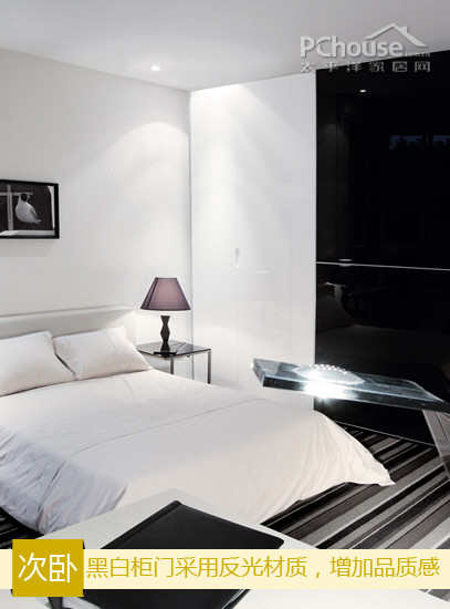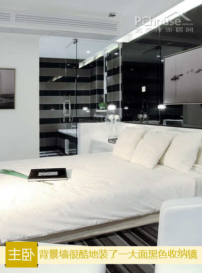 设计解析:背景墙很酷地装了一大面黑镜,打开来是个收纳柜,一幅黑白装饰画挂于中间,总体扩大了空间感和通透感,也十分节省收纳空间。