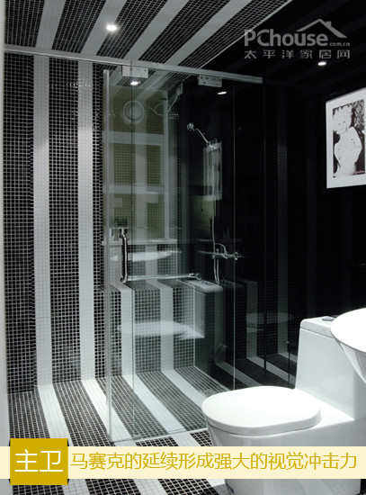 设计解析:设计师延续自家设计的理念,本案的主卫也采用了全透明玻璃门,继续演绎空间的开放性特质。内部黑白分明的马赛克从地板延续到墙面和地板,形成强大的视觉冲击力。