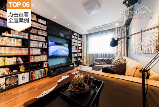 上榜理由:书墙兼作电视背景墙,漫画迷的巨大藏书量为电视主墙赢得了丰富的色彩,且省钱省工程;公共空间的主墙面采用台湾常见设计手法,把门片隐藏得很利落,空间整体性更强。[详细...]