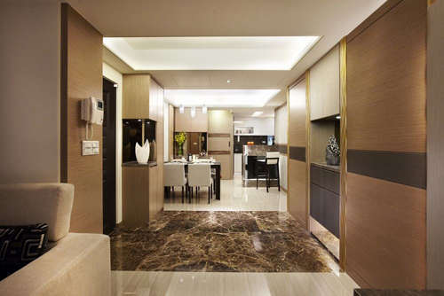 编辑推荐:石材与抛光石英砖的切换铺设,引导视线走入客厅与餐、厨两大公共空间。