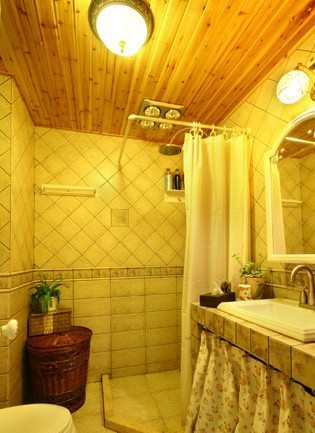实木吊顶和藤制收纳筐将卫生间注入浓浓的自然气息,整体功能设置简洁明快,舒适十足。