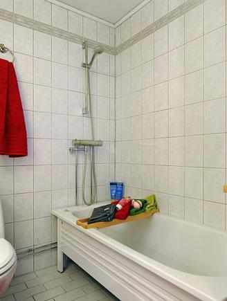 灰白色调的卫浴间突显出其纯净的气质,搭配洁白的卫浴设备营造出一个轻松惬意的温馨空间。四四方方的洁具造型,与白色面盆和谐搭配,让这空间看起来更加简洁。红色块毯和毛巾的点缀,为空间带来温馨的舒适感。