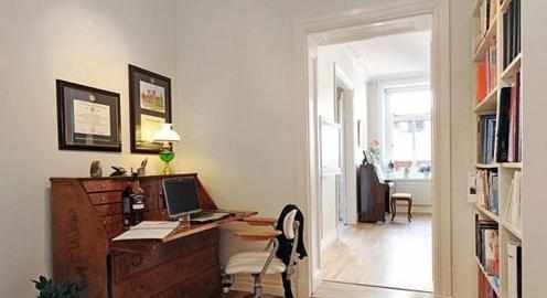 过道口设置了一张边桌让阅读区多了书写的功能,家具的布置尽量简化处理,以满足基本的阅读需求为前提,无需占据过太多空间,以免妨碍到正常的生活秩序。而这个没有窗户的角落里,复古造型的台灯就成为了提供光照的全部来源。