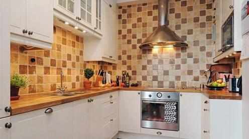 白色厨柜搭配上原木材质的料理台面,整个厨房空间融合这两种元素后,不仅提升厨房整体的质感,温润的质感也使人不自觉地更从容,更有条理。用小块瓷砖拼搭出的背景墙,除了增加一抹能减压的自然风味,还能在视觉上有效地进行降温。