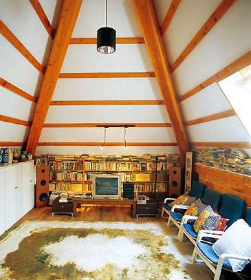 阁楼有效地被改造成一个影音娱乐室,白色的储藏柜打破了对称的格局,却让空间变得匀称。