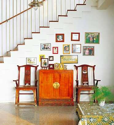 楼梯处的空间挂着家人不同时期的照片,与家中老桌椅相配,像保留记忆的容器。