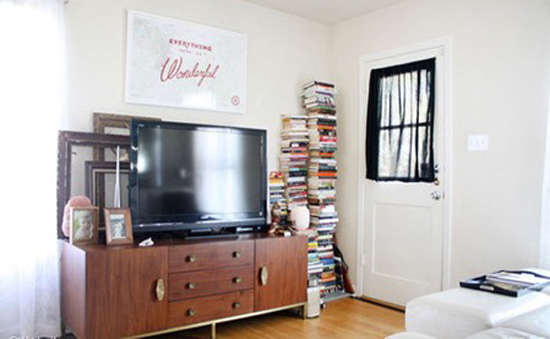 沙发对面是小巧玲珑的电视柜,搭配平板液晶电视,保持客厅的宽敞。灵活运用了大门后方的墙角位置,收纳了各式各样的书本,纵向排列的书本给纯白色的家居增添了彩虹般的活力。