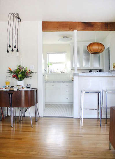 电视柜的左边是开放式厨房和四人圆形小餐桌。餐桌的靠墙摆放,保持客厅的宽敞,放上新鲜的花朵点缀餐桌,让客厅更有清新自然的气氛,到处飘着鲜花的香气,让人心旷神怡。厨房的流理台搭配高脚椅营造吧台氛围,在吊灯灯光的熏陶下营造浪漫气氛。