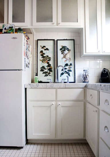 狭窄的厨房以白色为主基调,奠定厨房、明亮、整洁的风格,搭配淡雅的壁画点缀,增添厨房的颜色设计。仿大理石花纹瓷砖流理台,清洁油污等顽固污渍的时候也比其他材质更容易清洁。