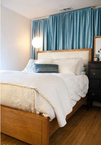 单身公寓的主人房用清纯的白色搭配爽朗的蓝色呈现主人的向往自由的单纯性格。使用QueenSize实木双人床厚重稳固,和地板的颜色浑然一体,让主人房有一种蓝天白云下的沙滩的画面感。