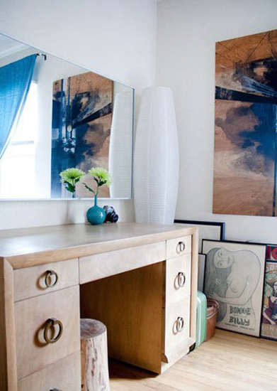 原木梳妆台搭配了树桩椅子,简单的原始设计让主人房散发出自然的味道,在淡淡木香的陪伴下入睡可以放松平日工作紧绷的神经。墙上挂上自己喜爱的蓝天白云壁画,更加明显地说明屋主对自由的向往。