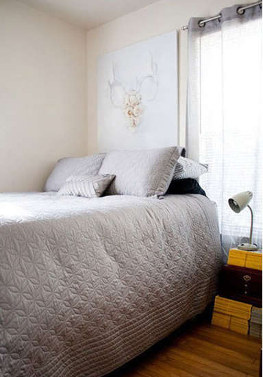 纯白色的纯棉沙发在寒冷的冬天最适合给人恰到好处的温暖,营造清新幽雅的客厅。同时,在墙壁用了一面中国风窗花式镜子将客厅的视觉空间扩大两倍,让客厅保持宽敞明亮。在墙壁上安装了羊角设计的挂钩,代替衣帽架的收纳功能,减少地面的占地空间,保持客厅干净利落。