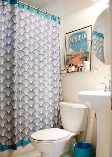 浴室以白色为主,蓝色为辅装点,体现出浴室的清爽感觉。扇贝花纹的浴帘就好像在沙滩上丰收的扇贝。浴帘脚的天蓝色和垃圾桶的天蓝色搭配起来,让浴室的设计主题得到统一,给人和谐、舒适的清新自然感。