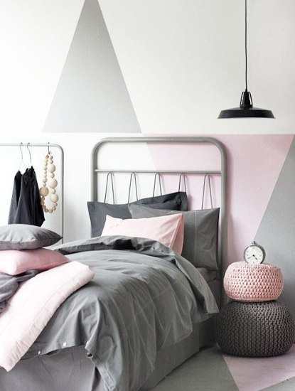 简单的铁艺床,铺上灰色床品,搭配粉色抱枕,与墙面地面相得益彰,空间不经意流露出简单和谐之美!用两个编制的叠加圆凳作为床头柜,别有心思!