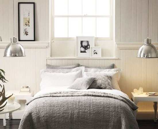 不占床头柜空间,用了两个吊顶作为床头灯,只是一点点的改变就让整个空间创意无限;窗户不大?就直接作为背景吧,享受早晨第一缕阳光照在身上的感觉。