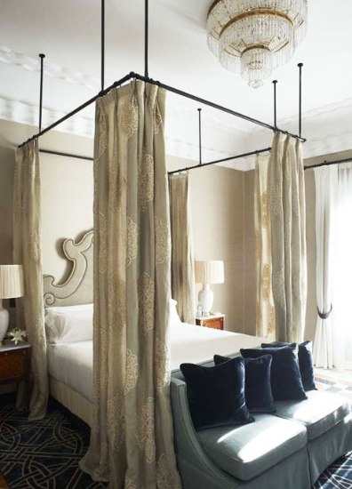 想要窗幔还要简洁,那就在床的上方简单勾勒出一个窗幔架吧,不需要太多装饰,简单四方图形即可,搭配与床头相仿色系帘子,一整夜都睡得很安稳!