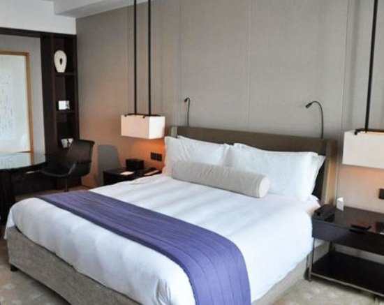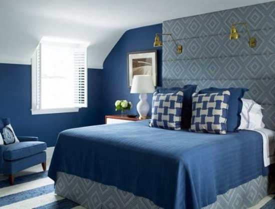 以深蓝为主,卧室彷如沉浸在一片蓝色的海洋里;床头柜上的两盏白色台灯犹如海洋上的明灯,恰如其分点缀着整个简单的卧室。