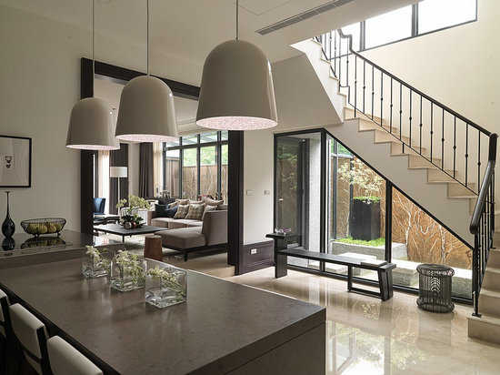 编辑点评:大片L型延伸的景观窗户,使建筑内外的界线逐渐模糊,室内范围更有往外延伸的感觉。