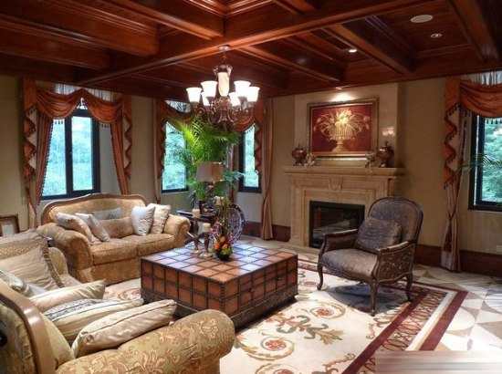 客厅的中间方块形的方桌精致特别,舒适的沙发靠垫,厚重的家具,色调细腻高贵。